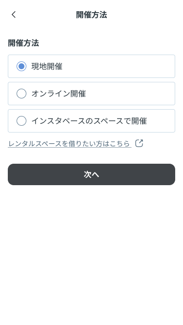 インスタベースと連携して全国のレンタルスペースを予約・反映させる方法と、場所名を直接入力する2種類から選択可能。